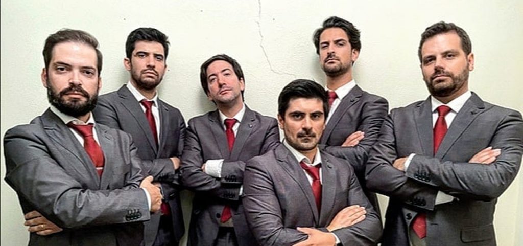 The group is currently composed of six elements: João Cristóvão (violin and mandolin), Mário Ferreira (accordion and voice), Pedro Figueiredo (percussion), Ricardo Almeida (voice and guitar), Rui Marques (double bass) and Tiago Nogueira (voice and guitar). All of them have, besides music, another profession: there are three doctors (Pedro, Ricardo and Tiago), a computer engineer (Mário), a civil engineer (Rui) and a music teacher (João). In 2017, the sextet started to achieve nationwide recognition and became one of the most famous bands in Portugal.